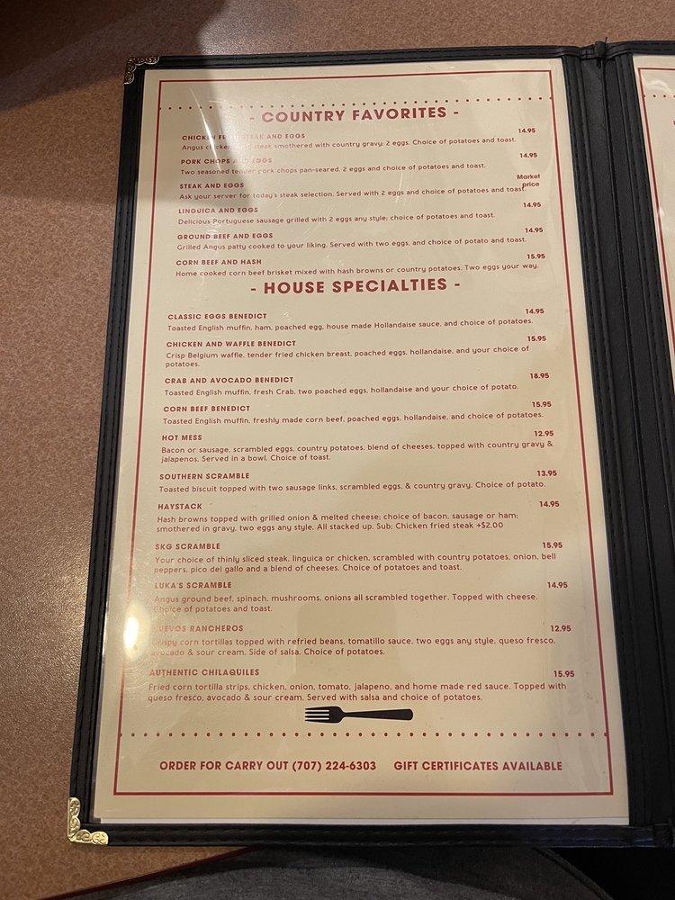 Welcome to South Kelly Grill, the inviting hub of breakfast and brunch located in American Canyon, CA. This charming eatery prides itself on a menu that showcases hearty, traditional dishes alongside vegan options, ensuring there’s something for everyone. Start your morning with their renowned Chicken Fried Steak and Eggs or indulge in their massive pancakes, which have earned rave reviews. For lunch, sink your teeth into an Angus Burger or the delightfully crisp Fish and Chips.